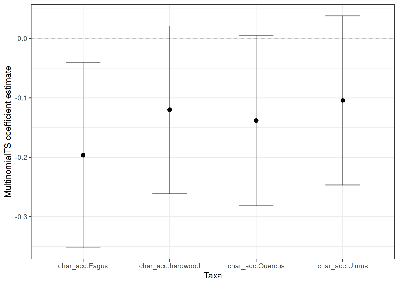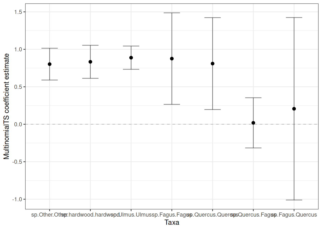 labs(x = "Taxa", y = "MultinomialTS coefficient estimate") +