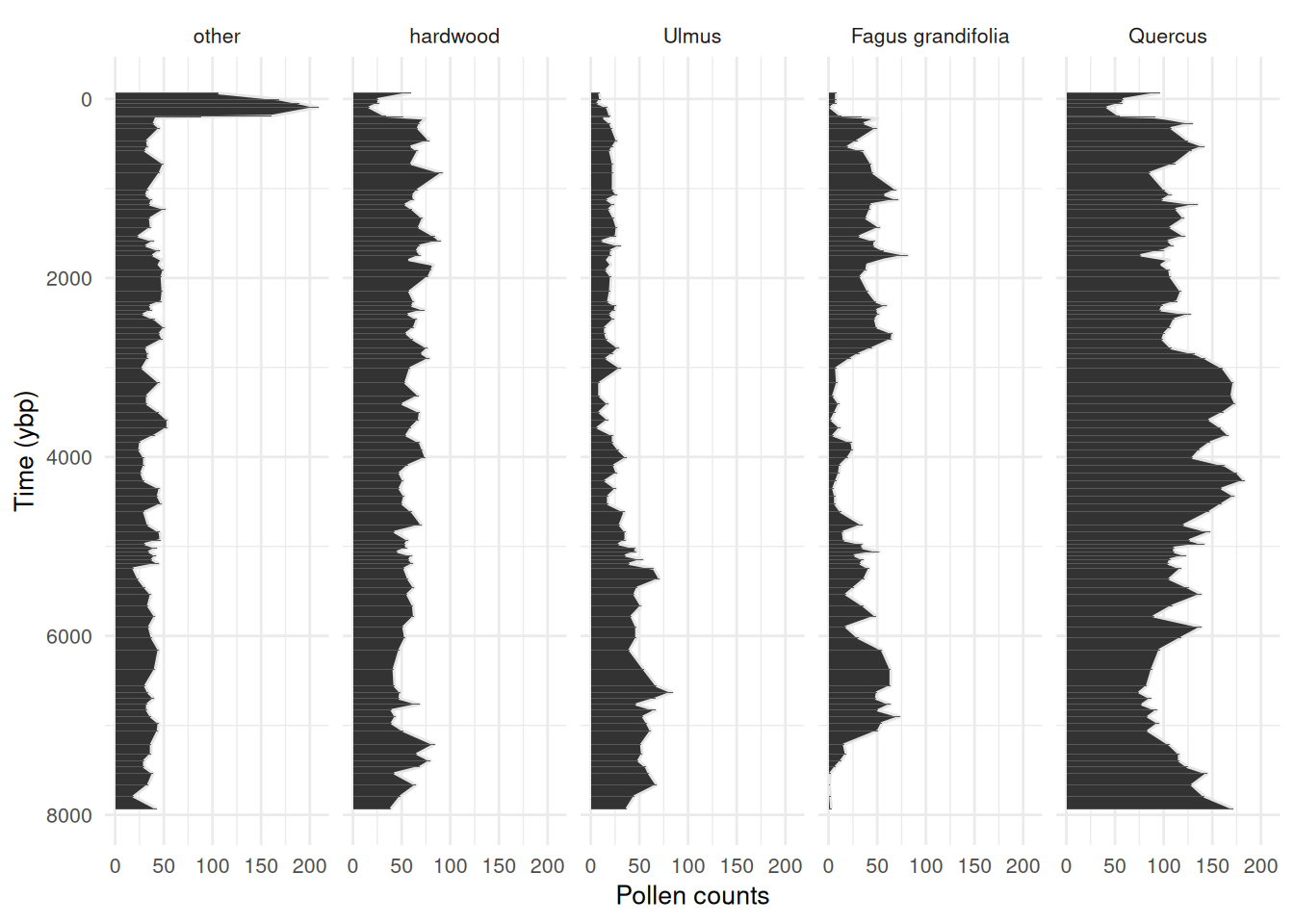 labs(y = "Pollen counts", x = "Time (ybp)") +