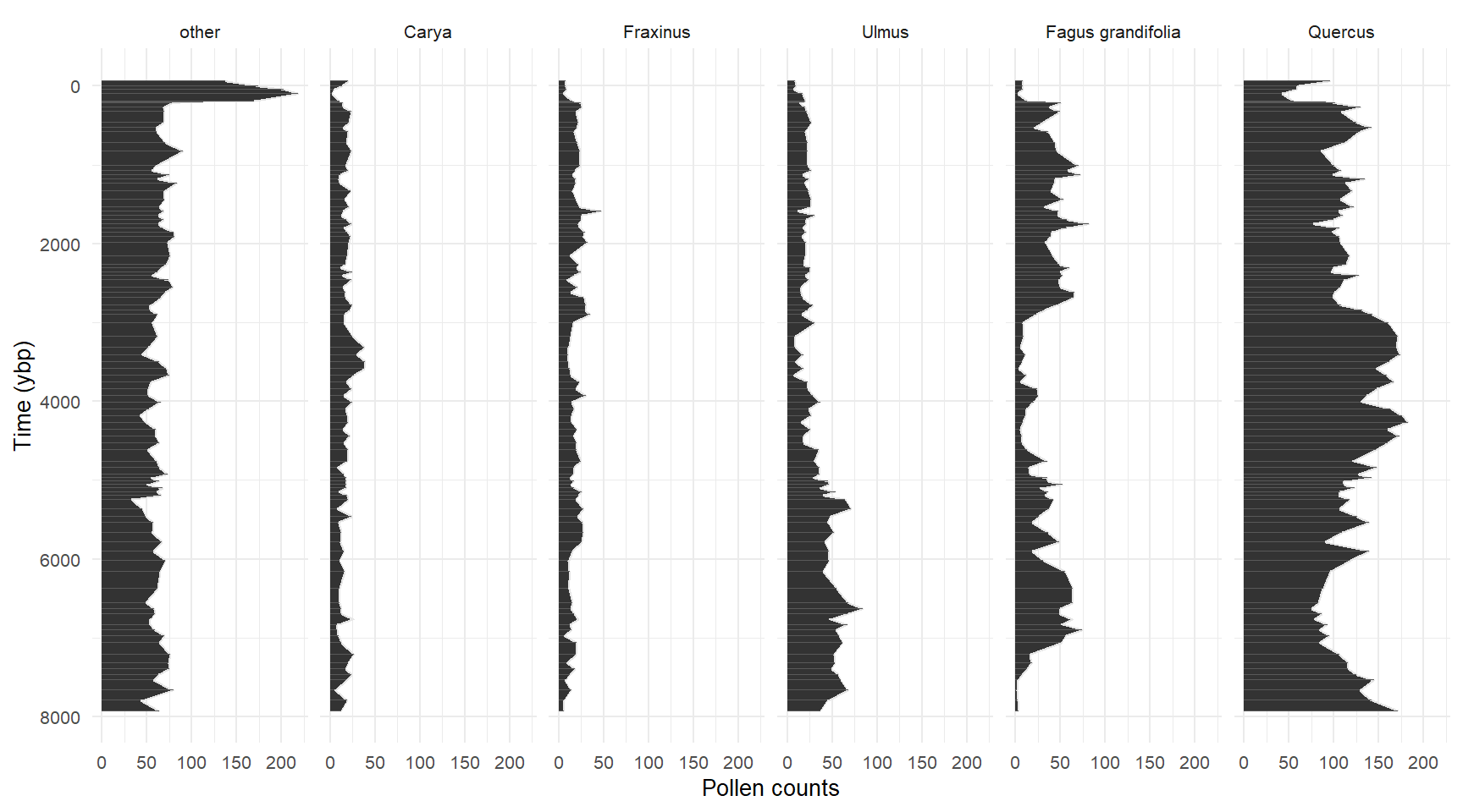 The response variable, \(Y\), is of count-type data. Covariates, \(X\), can be of mixed types (e.g., binary events, or charcoal accumulation rate).